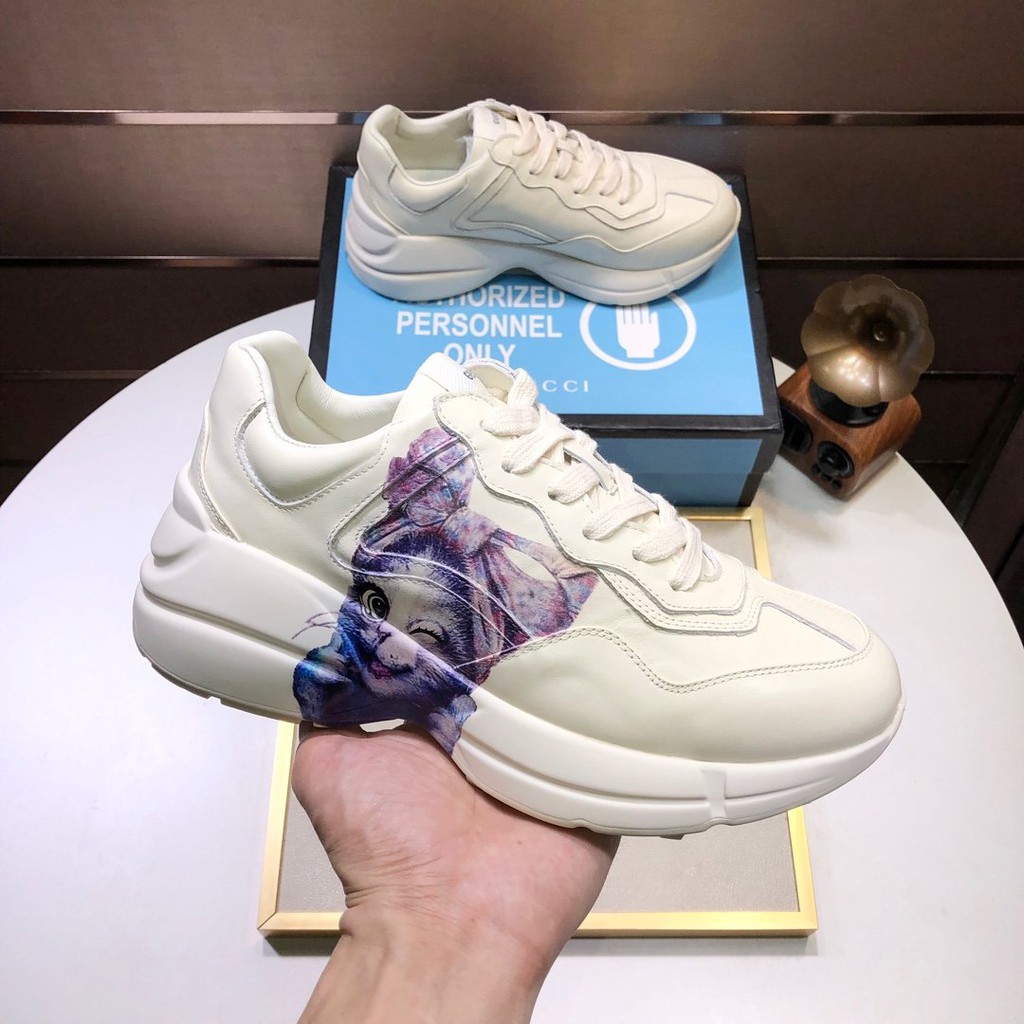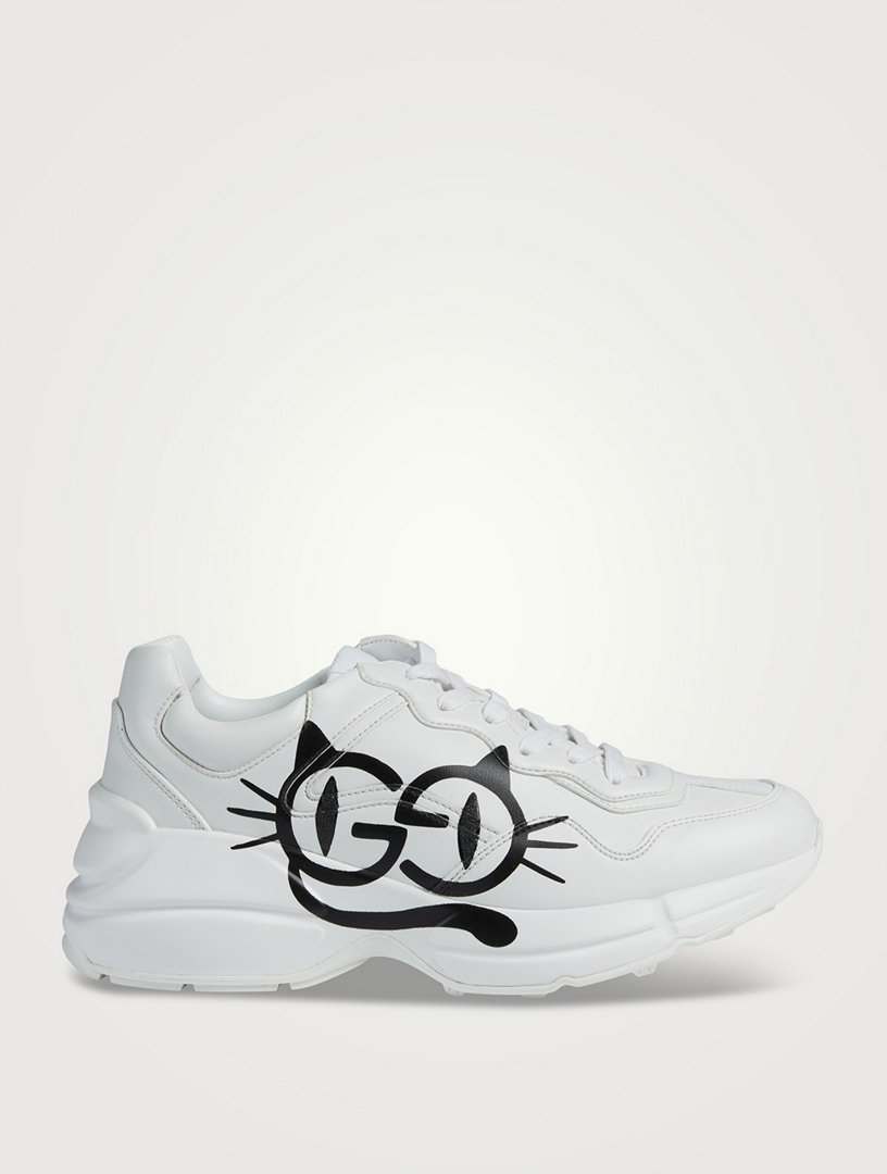 Buy Gucci Womens White Rhyton Sneaker With Cat Eyes. Made in Italy from premium leather set on a chunky rubber sole these lace-ups feature the Mystic Cat print on the sides influenced by vintage postcards. The sneaker is equal parts minimalist and fun and is an adorable addition to your footwear closet if youre looking for something that is easy-to-wear and has some character.